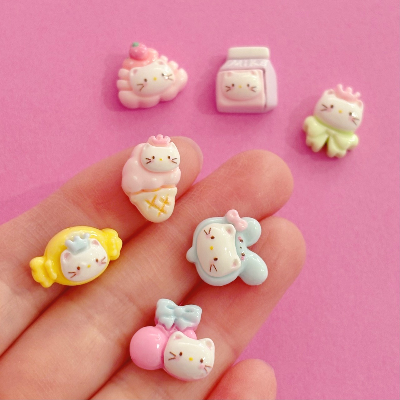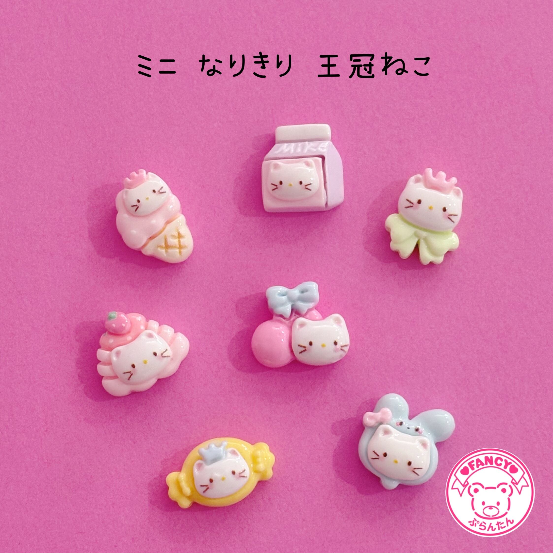 かわいい王冠をかぶった猫が スイーツなどになりきっている ミニサイズのデコパーツセットです。