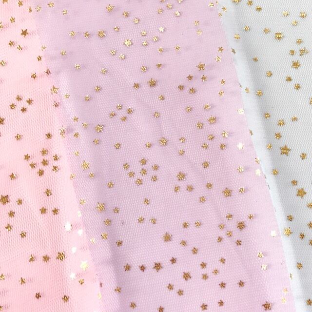 8cm幅のゴールドの星が 入った ソフトチュールリボンです。こちらのチュールは、手触りが 柔らかいタイプです。各色1mずつの計4mセットです。