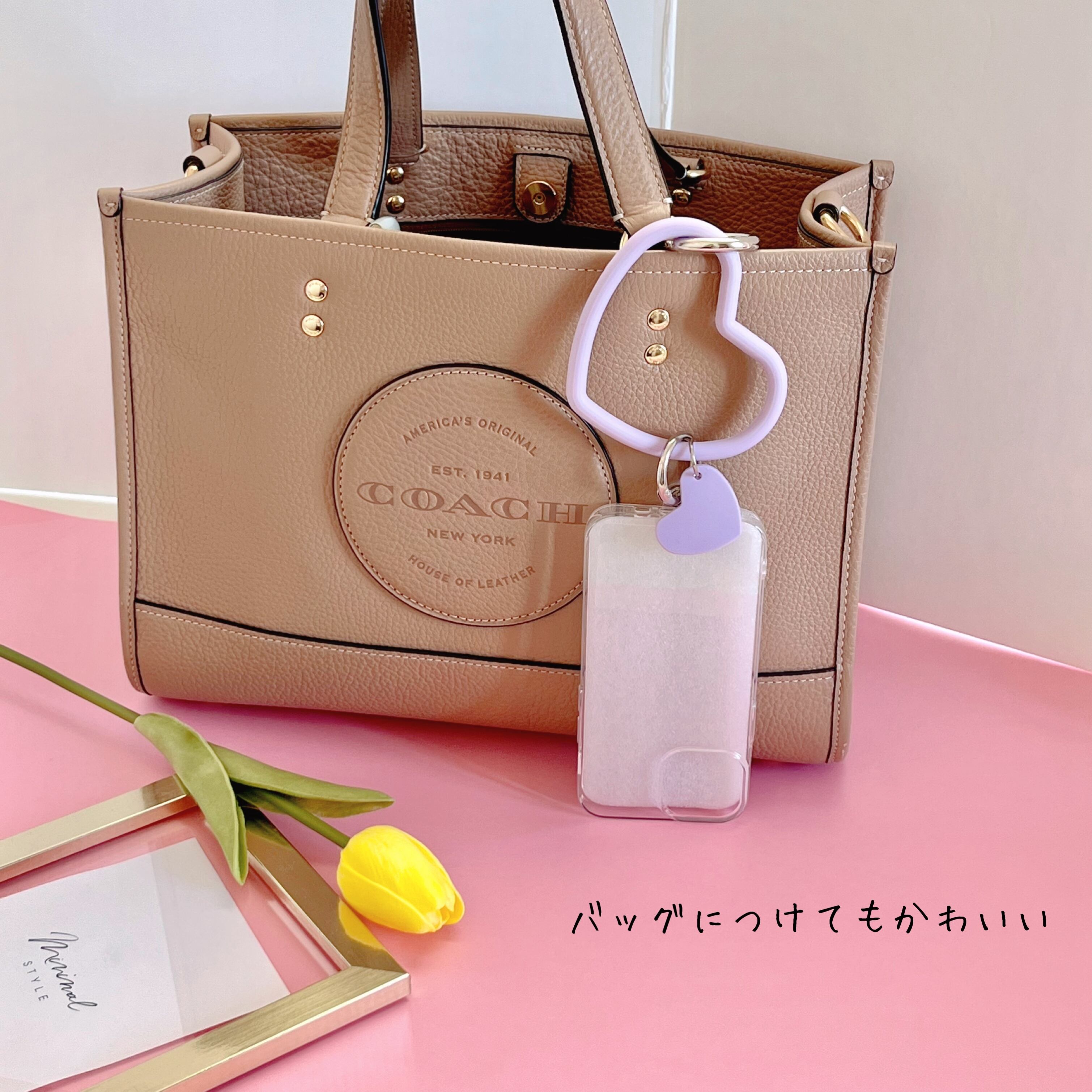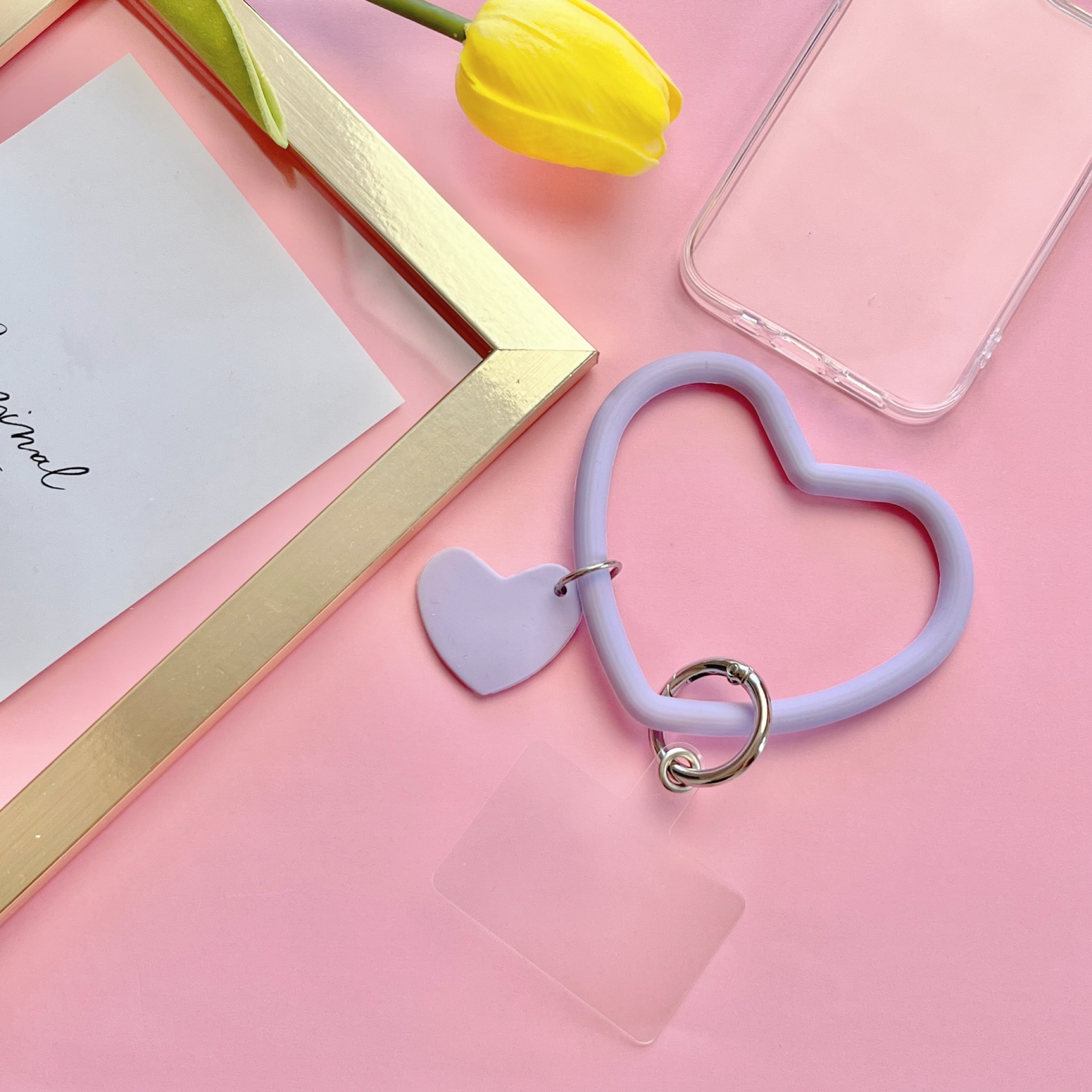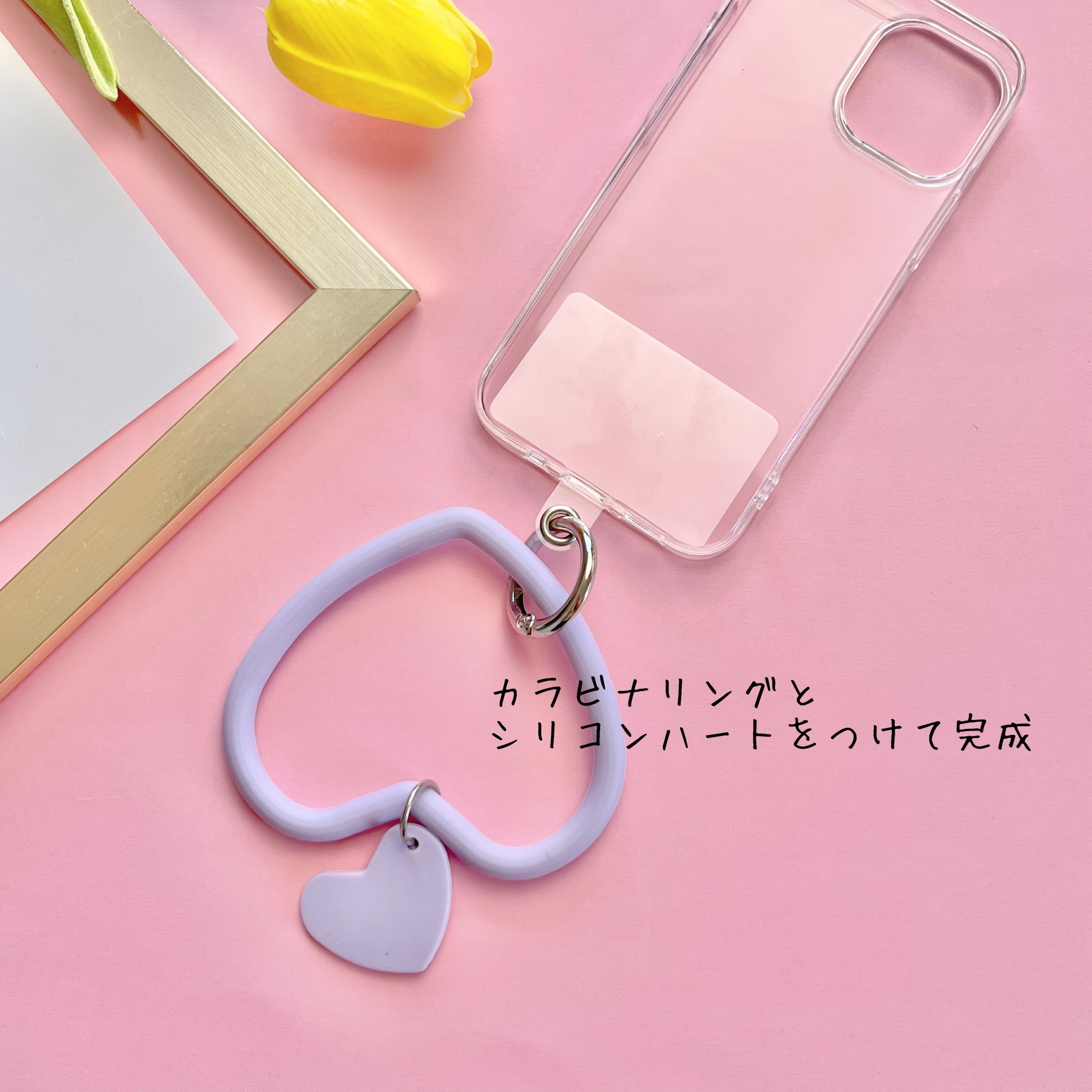 お手持ちのスマホケースに挟んで使用できる ストラップホルダー付き シリコン製のハート型スマホストラップ。